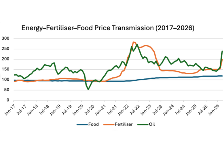 The key message is that energy price shocks do not remain confined to fuel costs. They propagate through production systems and emerge later in food prices. With both oil and fertiliser now rising again, the outlook points to renewed upward pressure on food inflation into 2026.