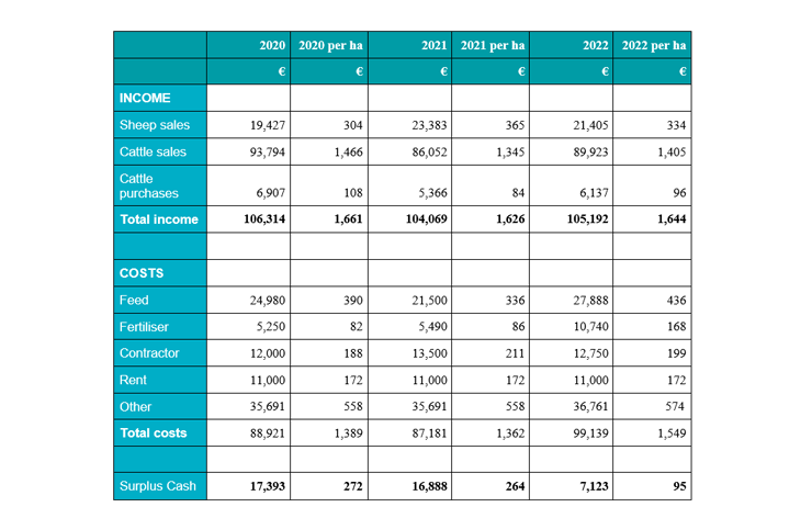 Note: Above figures do not include, subside payments, loan interest or depreciation. 2022 figures are a 2020/21 average with fertiliser increased by 100% and feed by 20%, all other costs increased by 3%. Income figures are based on a two year average. These figures do NOT inculded farmers own drawings / wages